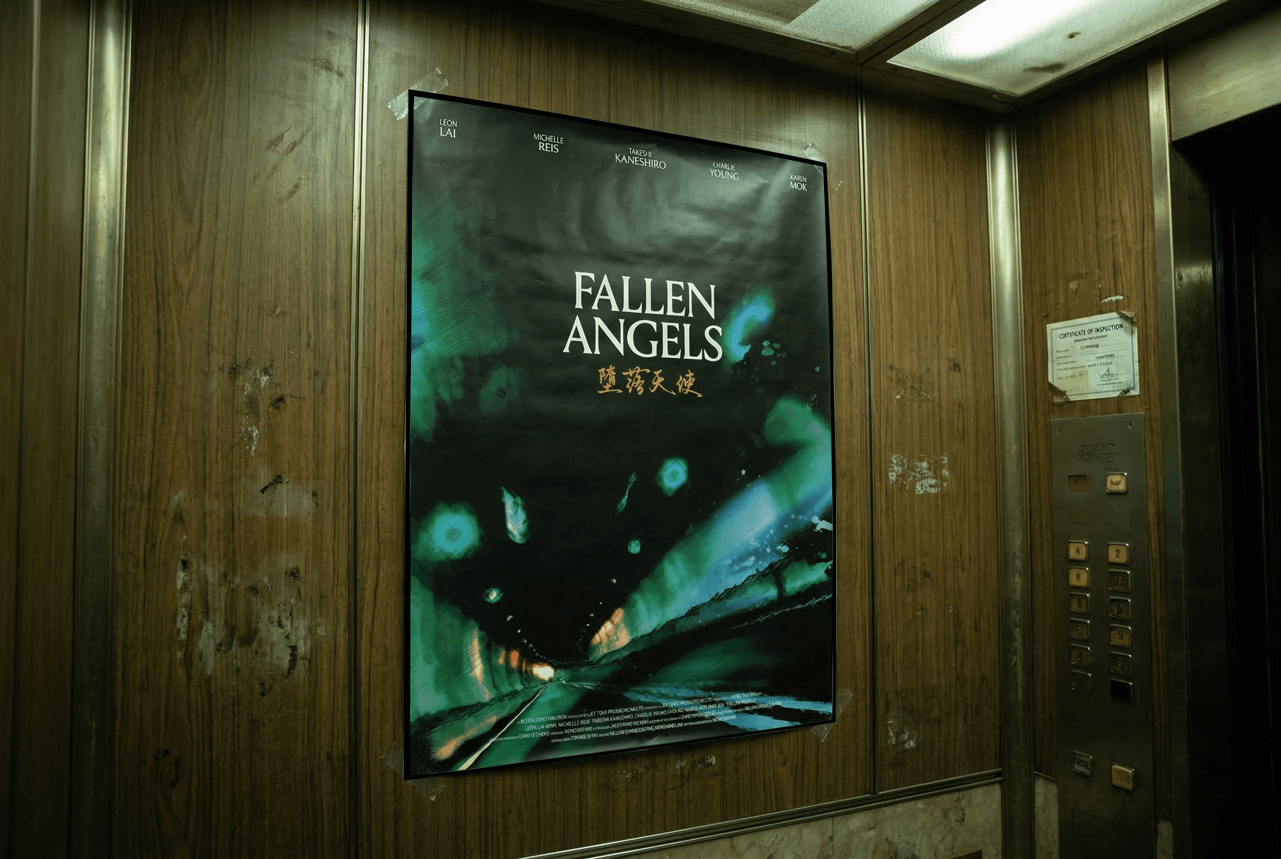 This poster reinterprets Wong Kar-wai’s Fallen Angels, translating cinematic mood into a still composition that prioritizes spatial tension and surface texture over narrative depiction. The central image is a tunnel photograph whose collapsing perspective implies motion and emotional distance. Later treatments added blur, streaking, and distressed texture to produce a fragmented, film-like surface.