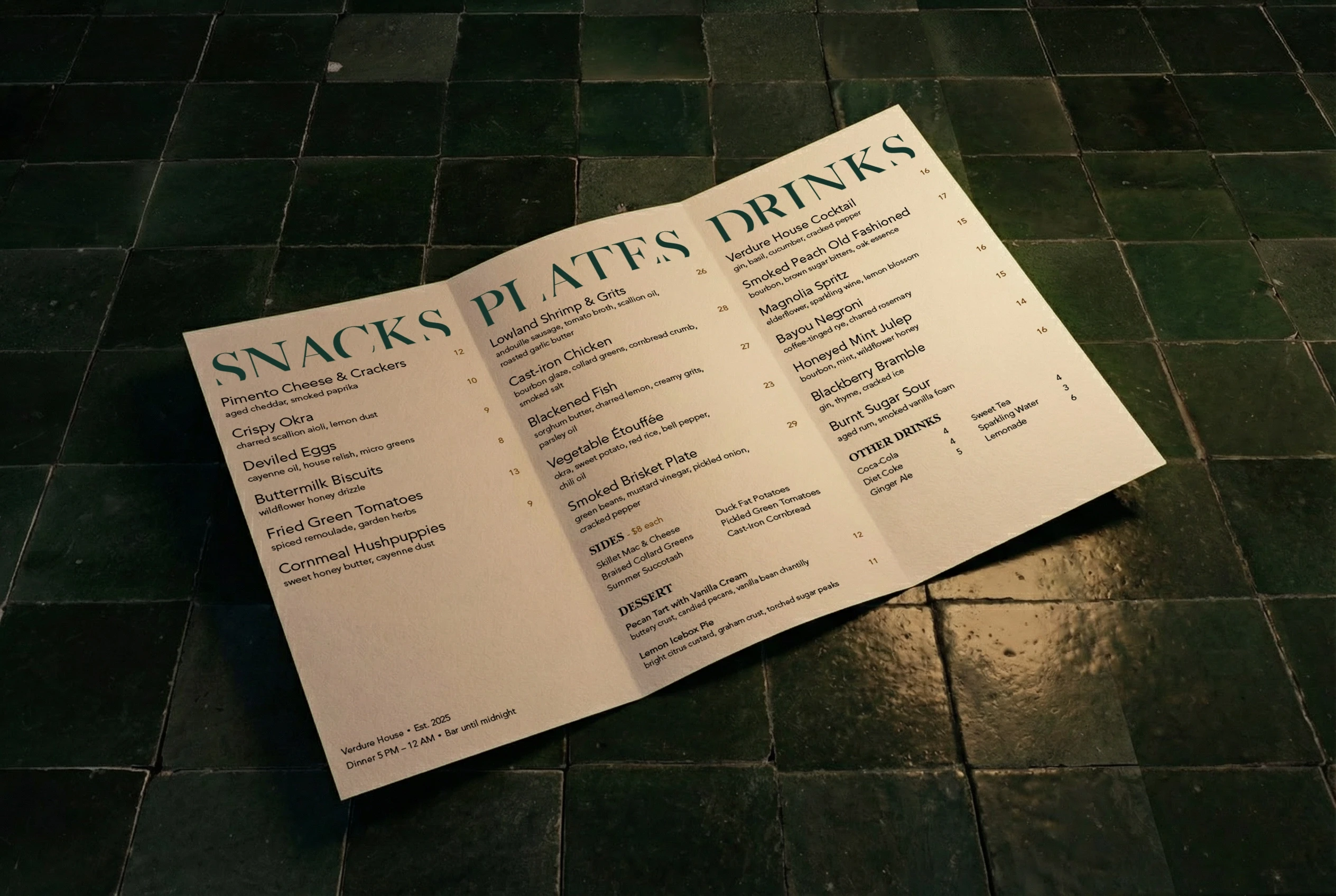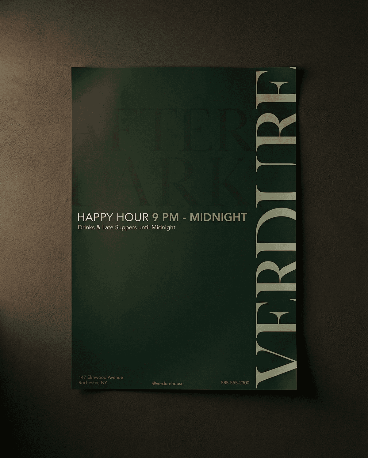 Verdure is an upscale southern comfort restaurant that opens after 9 p.m., where the dining experience is defined less by spectacle and more by restraint. The identity draws from the quiet atmosphere of late-night service, using typographic structure, spacing, and hierarchy to carry tone instead of imagery.